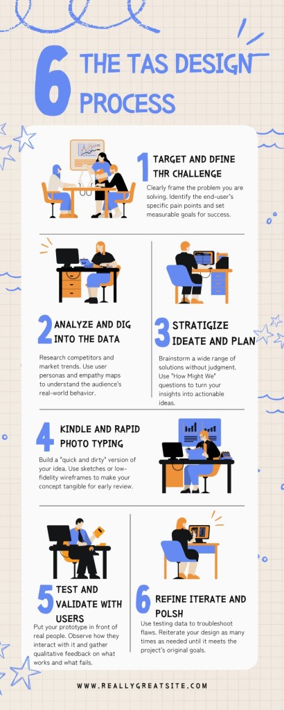 Your task is to create a Canva infographic that clearly explains how the TAS Design Process works in 6/7 steps.